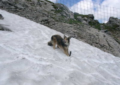 Dienstag erstiegen wir den Soiern. Auf dem Gipfel war Brigitte am Rande ihrer Kräfte. Eigentlich wollten wir die Gratwanderung machen. Da dies aber ein Umweg von mindestens zwei Stunden war, und Brigitte total erschöpft, stiegen wir über ein Geröllfeld hinab zur Soiernhütte.